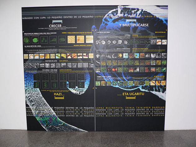 En la exposición se muestran una serie de paneles ilustrativos elaborados por dos briólogos del Museo de Ciencias Naturales de Álava, Patxi Heras y Marta Infante. Los paneles muestran la gran diversidad de formas que presentan los musgos y de su variada ecología, bajo el título conjunto de “Musgos: la añoranza del agua”. En este montaje, de gran impacto visual, uno puede sumergirse en el mundo de los musgos a través de decenas de fotografías, dibujos e imágenes microscópicas, bajo títulos tan sugerentes como: “Todo un mundo fascinante a escala diminuta”, “Crecer y multiplicarse”, “Lo pequeño es importante”, “Esponjas vivientes” o “Cien maneras de ser musgo sin morir en el intento”.
