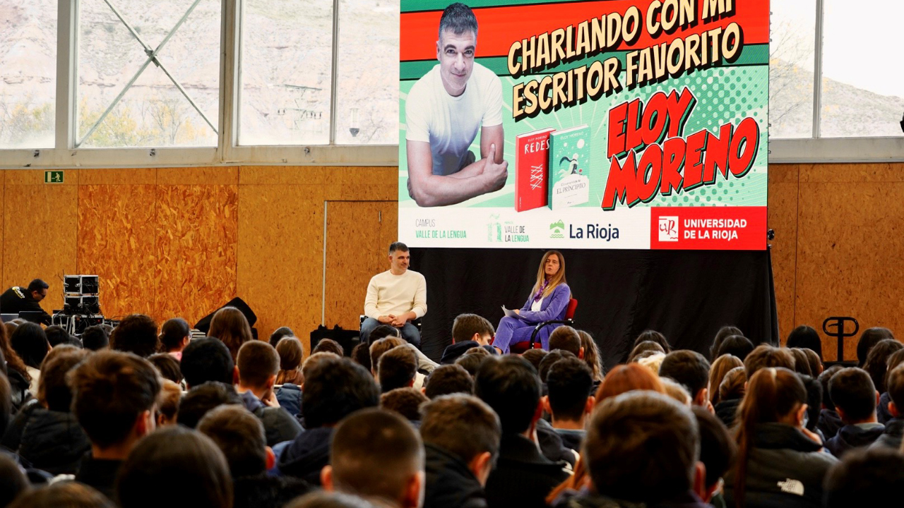 Cerca de 700 adolescentes riojanos esperaban al escritor castellonense en el Polideportivo de la Universidad de La Rioja, en donde ha compartido una interesante charla (a la que se puede acceder desde el canal de YouTube de la UR, www.unirioja.es/youtube) con Aurora Martínez Ezquerro, directora del proyecto Valle de la Lengua - Campus Valle de La Lengua de la UR.